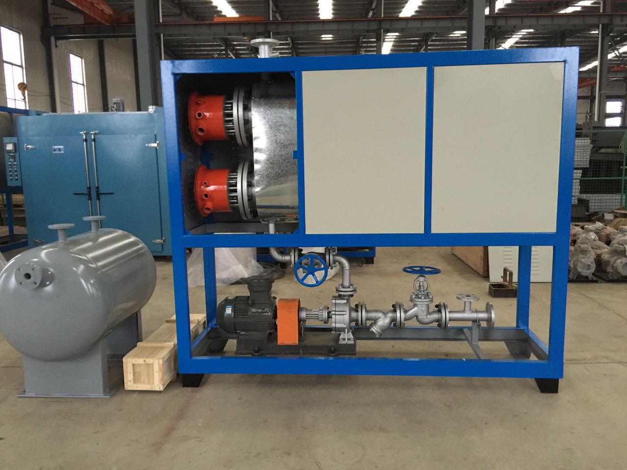 導(dǎo)熱油爐排氣流程: 1、導(dǎo)熱油通過膨脹槽注油口處加注,并通過膨脹口管道流入設(shè)備及油爐本體內(nèi),此時注油時一定要打開系統(tǒng)中所有的閥門(放油閥除外),讓導(dǎo)熱油流入筒體及需加熱設(shè)備內(nèi)。 2、當(dāng)液面顯示約為膨脹槽高度1/2時,停止注油。 3、首 行常溫排氣:接通電源,打開導(dǎo)熱油加熱器的進出口閥門及排氣閥(膨脹管道閥門需一直開著以及時補充油量),按動油泵啟動按鈕,油泵運行,油泵應(yīng)按箭頭指示方向正常運行,壓力表壓力顯示在規(guī)定范圍內(nèi),視聽油泵運行情況,如有異常現(xiàn)象應(yīng)立即停機檢查,將故障排除后再重新起動油泵,進行常溫下排氣,直至壓力表指示穩(wěn)定。進行常溫排氣時,要注意觀察膨脹槽內(nèi)的液位,當(dāng)?shù)陀谝?guī)定的液位高度時要及時進行補充。 4、升溫脫水:在確認(rèn)常溫下運行正常后,即可進行升溫脫水排氣(操作前詳閱導(dǎo)熱油使用說明書及溫控儀使用說明書),升溫脫水排氣可按如下步驟進行: 步:升溫至100-120℃保溫 開始升溫時,應(yīng)該控制升溫速度在50℃/h以內(nèi),并且監(jiān)視壓力表顯示是否正常,如發(fā)現(xiàn)無壓力或壓力不穩(wěn),說明系統(tǒng)內(nèi)仍有殘留氣體,此時要求按3要求重復(fù)進行常溫排氣操作,待系統(tǒng)壓力穩(wěn)定后方可繼續(xù),升溫至120℃后進行長時間保溫,保溫時間的長短與系統(tǒng)總?cè)萘考皩?dǎo)熱油的質(zhì)量有關(guān)。  第二步:升溫至150-180℃保溫。  排除油中輕組分、揮發(fā)物及殘余水分,請參照KRD系列導(dǎo)熱油加熱器系統(tǒng)脫水排氣曲線圖操作 第三步:脫水排氣完成后要關(guān)閉排氣閥(其它閥門無需關(guān)閉),投入正常升溫運行。 5、 升溫脫水排氣過程有關(guān)事項。 升溫過程中管路可能會發(fā)出碰擊的響聲,說明系統(tǒng)內(nèi)有大量氣體或管道不暢,此時要降低升溫速度,待氣體排除便可消除聲響;如系管道不暢所至應(yīng)予以排除。 脫水排氣過程可能會有大量氣體涌入膨脹槽,造成槽內(nèi)導(dǎo)熱油外溢,操作前要在溢油管下安置好溢油容器。 進行脫水排氣時,現(xiàn)場必須有人員看守,發(fā)現(xiàn)異常及時處理。   對于所提的油泵無油或少許油流出的問題,解決方案如下: 1、 關(guān)閉出油口閥門,啟動油泵,觀察壓力表顯示情況,若無壓力,則說明回油口無油補充油泵,使得油泵空轉(zhuǎn),無后續(xù)油及時補充,則請貴司檢查一下回油口的供油情況,此時請確保膨脹槽里有油并膨脹管道閥門打開和需熱設(shè)備有油并出油口閥門在打開狀態(tài)。 2、 如果以上要求都執(zhí)行到位,壓力表還無壓力,請檢查油爐上的油泵、截止閥及過濾器是否堵塞。 3、 若壓力表顯示壓力值,而油泵、截止閥及過濾器并無堵塞,那油爐的出油口一定會按油泵所提供的流量進行流出。